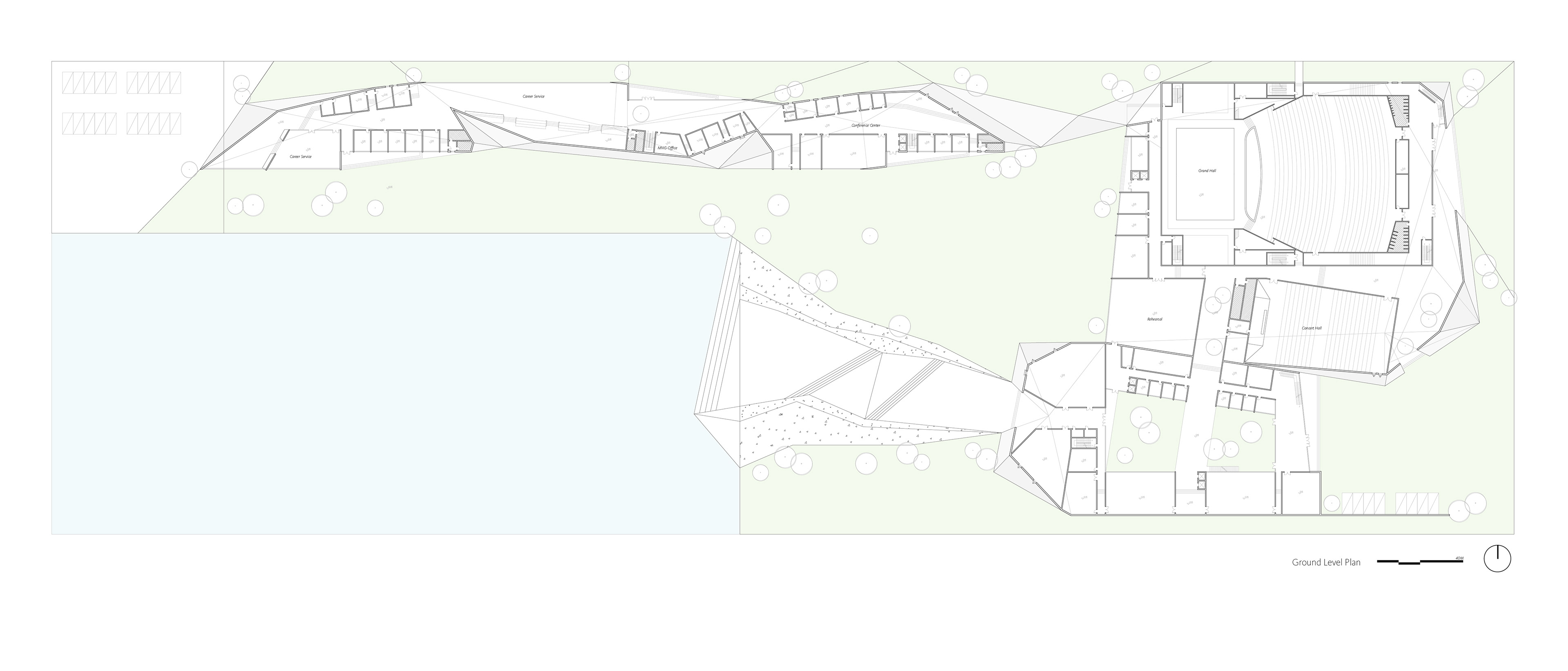 The plan of the whole design is connected by the continuous folding plates along the lakeside site. The tilted concrete plates created the main attractions along the outlet of the site as well as the interesting interior spaces along the design serves as the entrances or halls. In the terms of function, the north side of the building includes student office and information hall, with the easiest access from students’ daily routine from dorm to teaching buildings. The north-east corner of the building is designed to be the campus theater with the best visual location and exit routes for the coming crowds. The south-east part of the building is the student art center includes space for art club practice and lessons. From the west entrance of the student art center to the lake, there’s a grand stepping area which also serves as a outdoor gallery for students host spontaneous art activities.